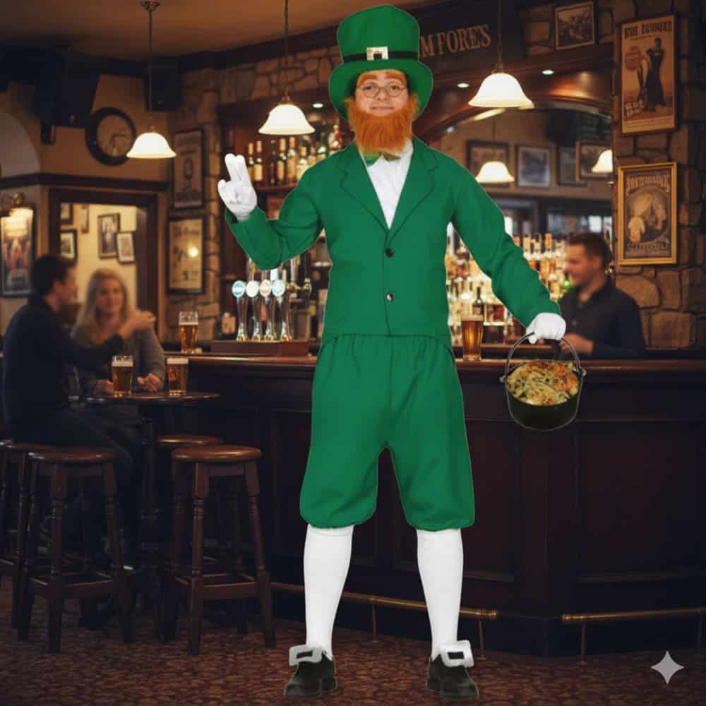 Déguisement Saint Patrick Leprechaun homme 5pcs. Matière 100% polyester. Poids : 450 g. Composé d’une veste, d’un pantalon court, d’une barbe, d’un jabot et d’un chapeau. Taille 52/54. Vendu sans les accessoires. Lavable à la main à froid. Livré dans une housse pour porte-manteaux