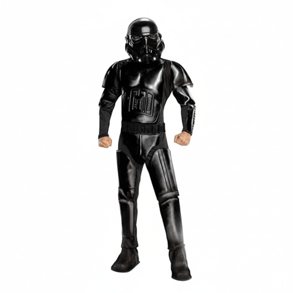 1x déguisement LUXE Shadow trooper™ Star Wars™ homme. Matière 100% polyester et pvc. Poids : 920g. Composé d’une combinaison rembourrée avec couvre-bottes et éléments d’armure en 3D et d’un masque en 2 parties. Vendu sans les accessoires. Taille L (tour de poitrine 116cm, tour de taille 91-101cm). Lavable à la main à 30°. livré dans une housse pour porte-manteaux