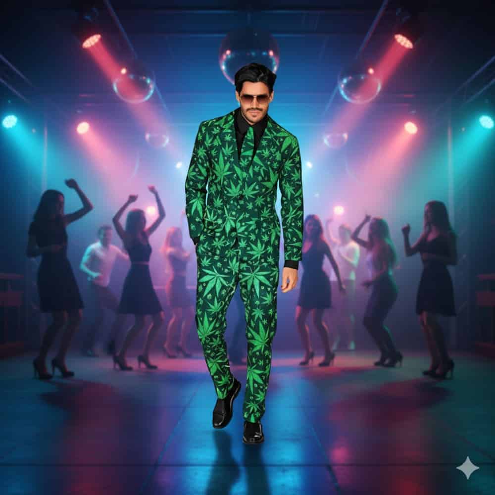 Costume 3pcs motif “CBD Style” VERT adulte. Matière 100% polyester. Poids : 690 g. Composé d’une veste, d’un pantalon et d’une cravate assortis. Vendu sans les accessoires. Taille 46/48. Lavable à la main à froid. Livré dans une housse pour porte manteaux.