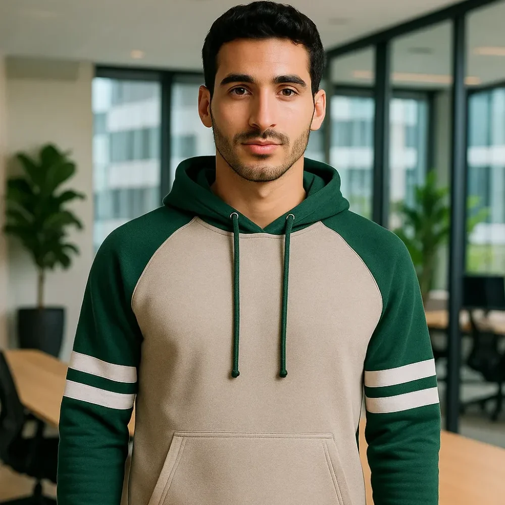 50% coton 50% polyester Nublend. Sweat à capuche en tissu NuBlend résistant au peluchage, fabriqué à partir de coton américain issu du développement durable, haute densité de points pour une impression lisse, corps principal gris avoine pour un look rétro et moderne, manches raglan contrastées, rayures d’inspiration athlétique sur les manches, poche avant, poignets et ceinture côtelés. Étiquette amovible.